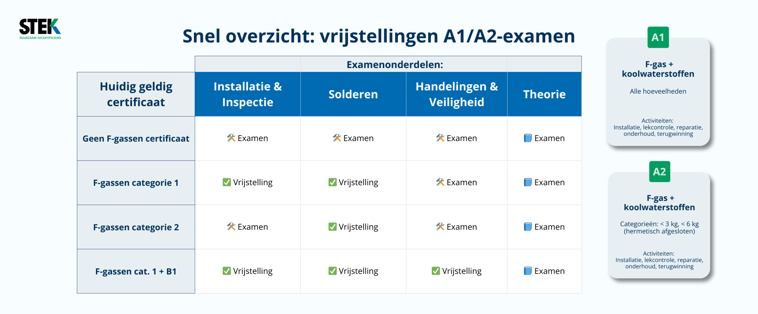 Kandidaten met een F-gassen certificaat Cat. 1 komen in aanmerking voor vrijstellingen. Deze informatie wordt gelijktijdig met de overige examendetails gepubliceerd.